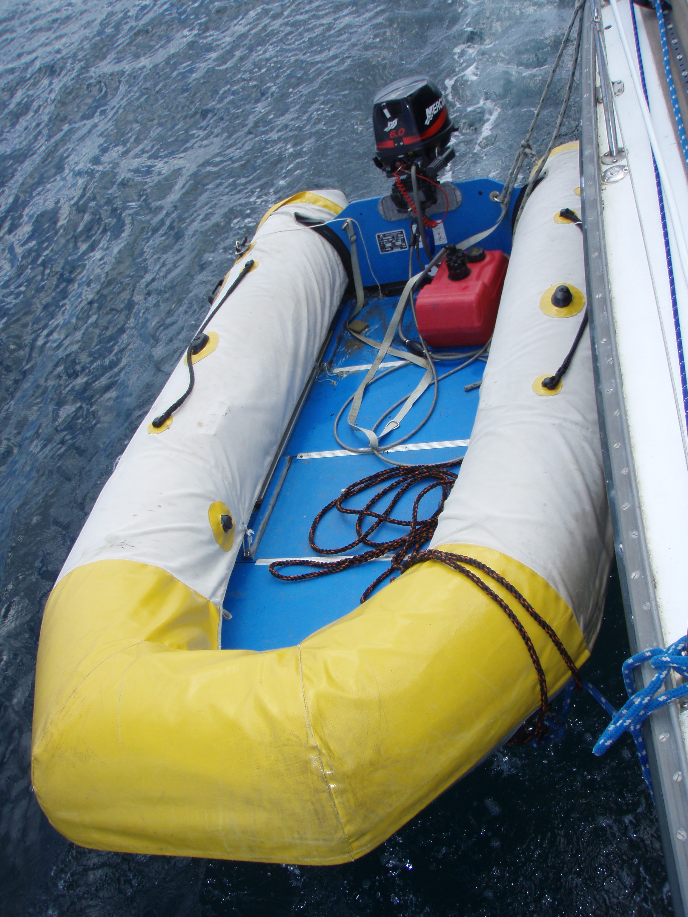It happened where the hard transom joined the soft floor. It wasn’t that he was leaking air but rather slowly letting in water so keeping gear/food/us dry and salt free became impossible. Despite several attempts we could not patch him properly, no amount of glue or 5200 would withstand the constant folding. We loved our Timmy but eventually grew tired of driving around a wading pool. When we reached Fiji we decided was time to treat ourselves to a new dinghy.
