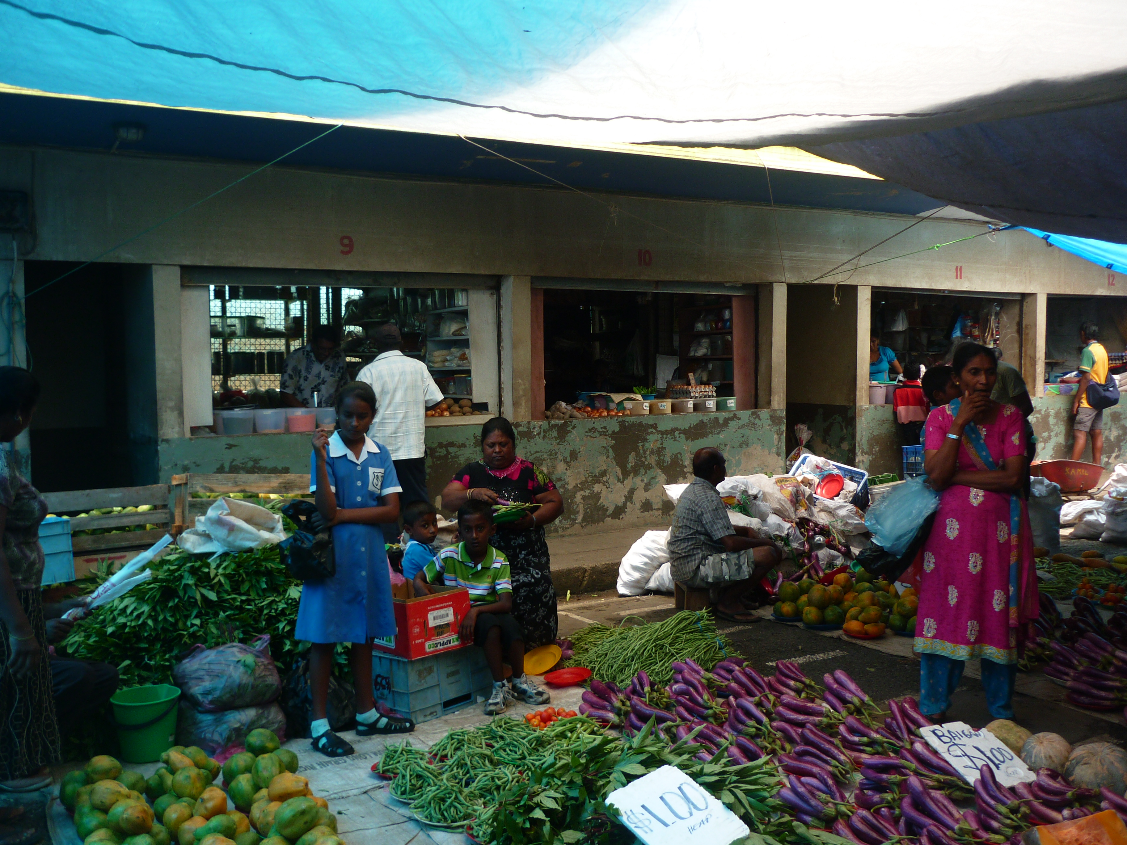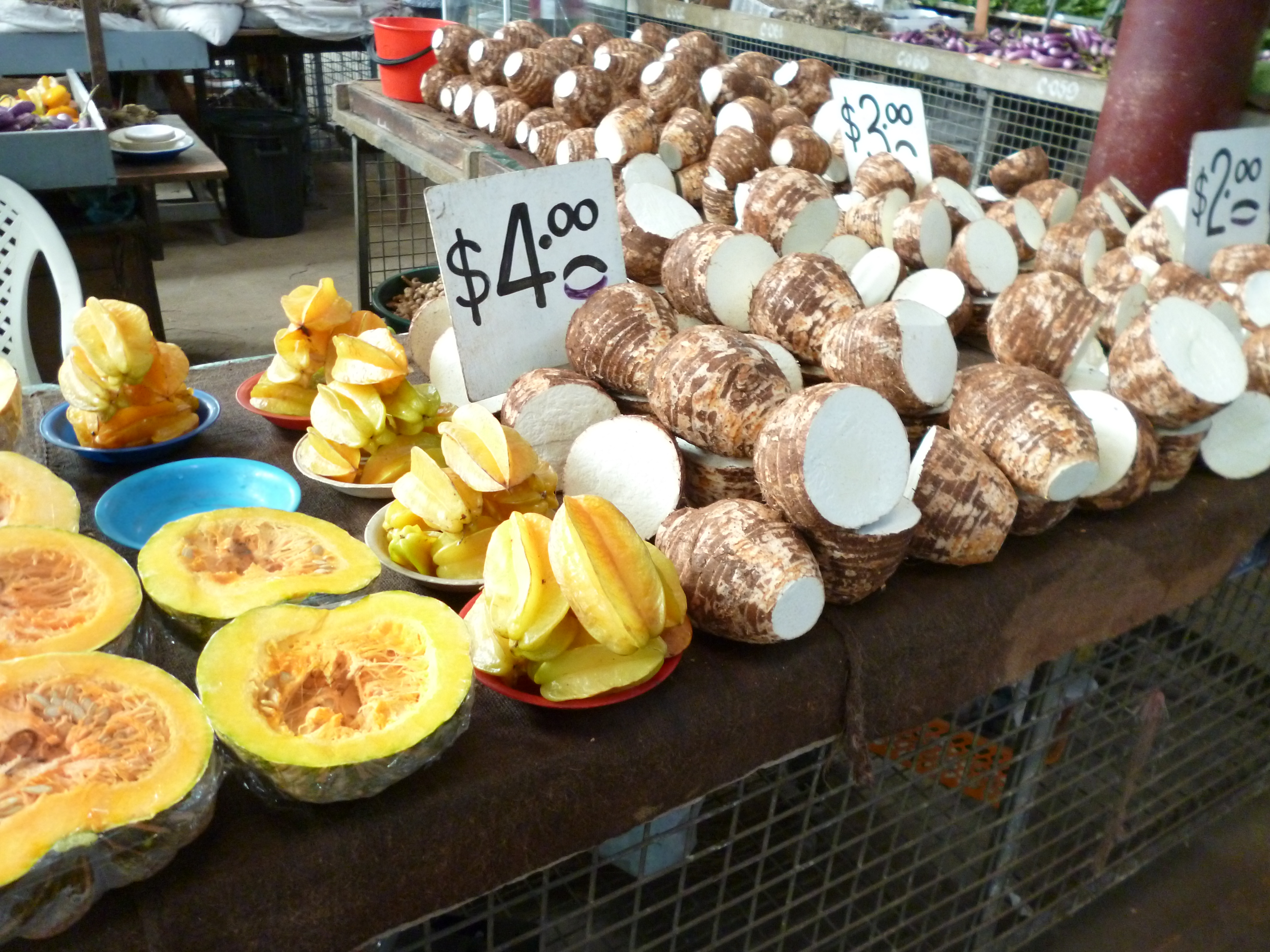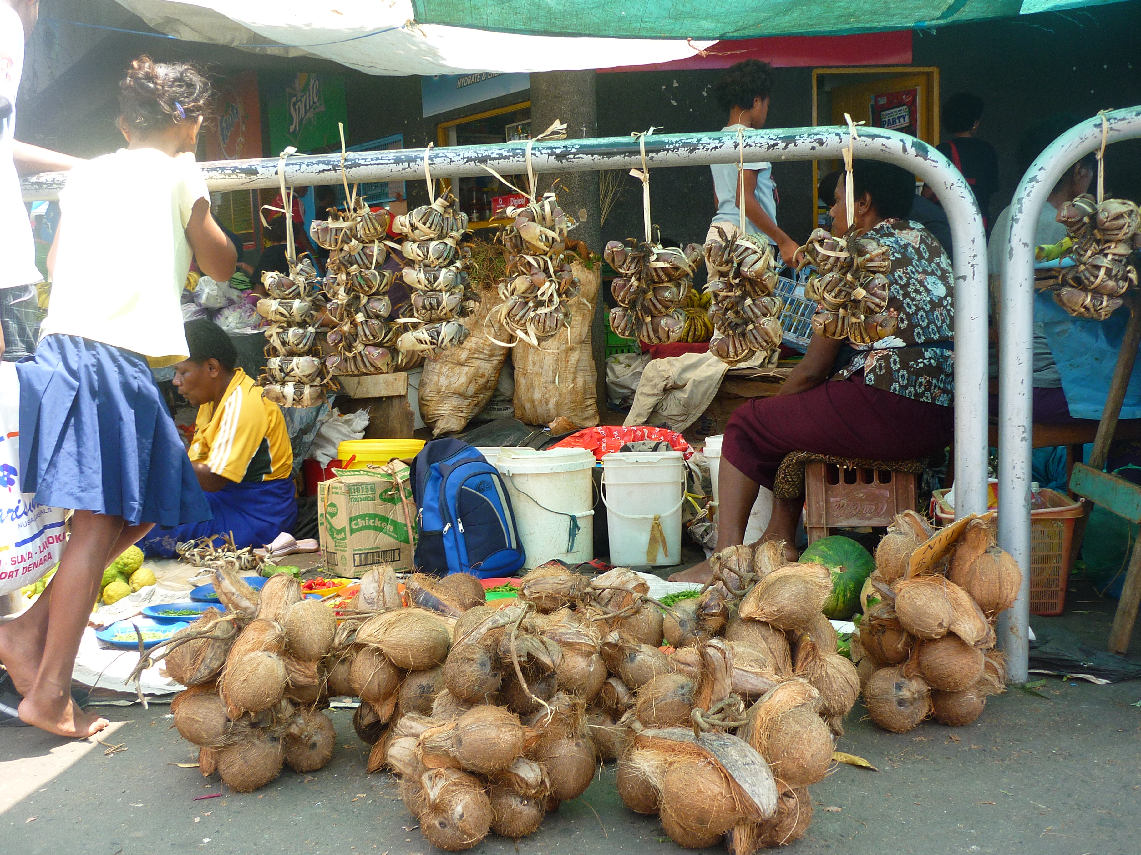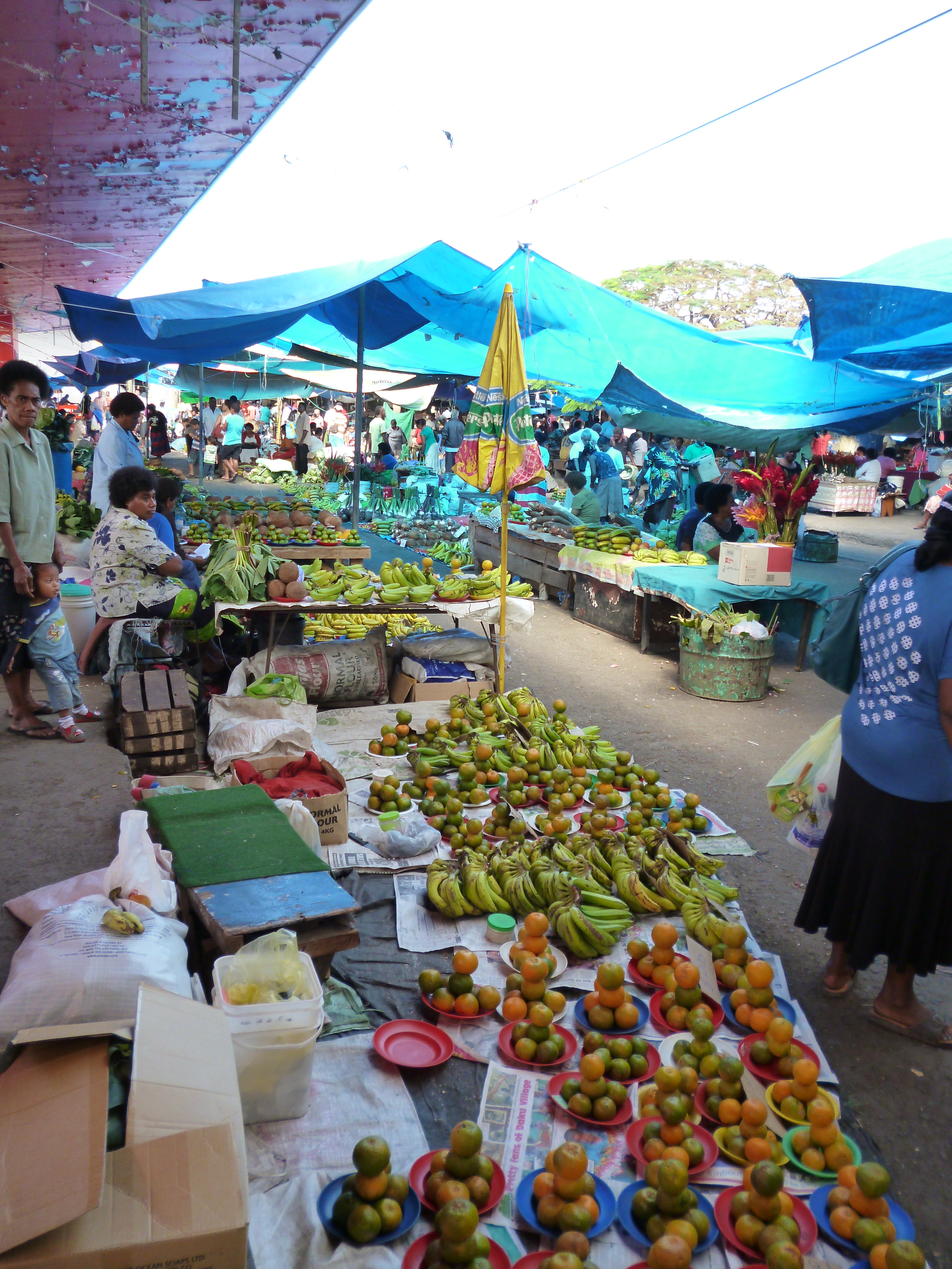 In Fiji, like most places we’ve been, Saturday is Market Day. Although the municipal market is open everyday of the week Saturday is when at it’s biggest and it’s best. People come from the surrounding towns, villages and islands to buy and sell fruits, vegetable and handmade goods. Often the people from far away will arrive in the city on Thursday and stay until end of Saturday. The permanent cement building in the center of Lautoka City is not big enough to house the influx of vendors, so the market overflows into the surrounding parking lot and courtyard and sprawls onto the sidewalks. Instead of the tables that are inside people outside spread plastic table cloths and old flour sacks on the ground and string up tarps with elaborate labyrinths of string for shade. It is shoulder to shoulder negotiating the cramped isles, often times getting pushed past your intended stop by the flow of people so that you have to double back when you find a break in the line of bodies.