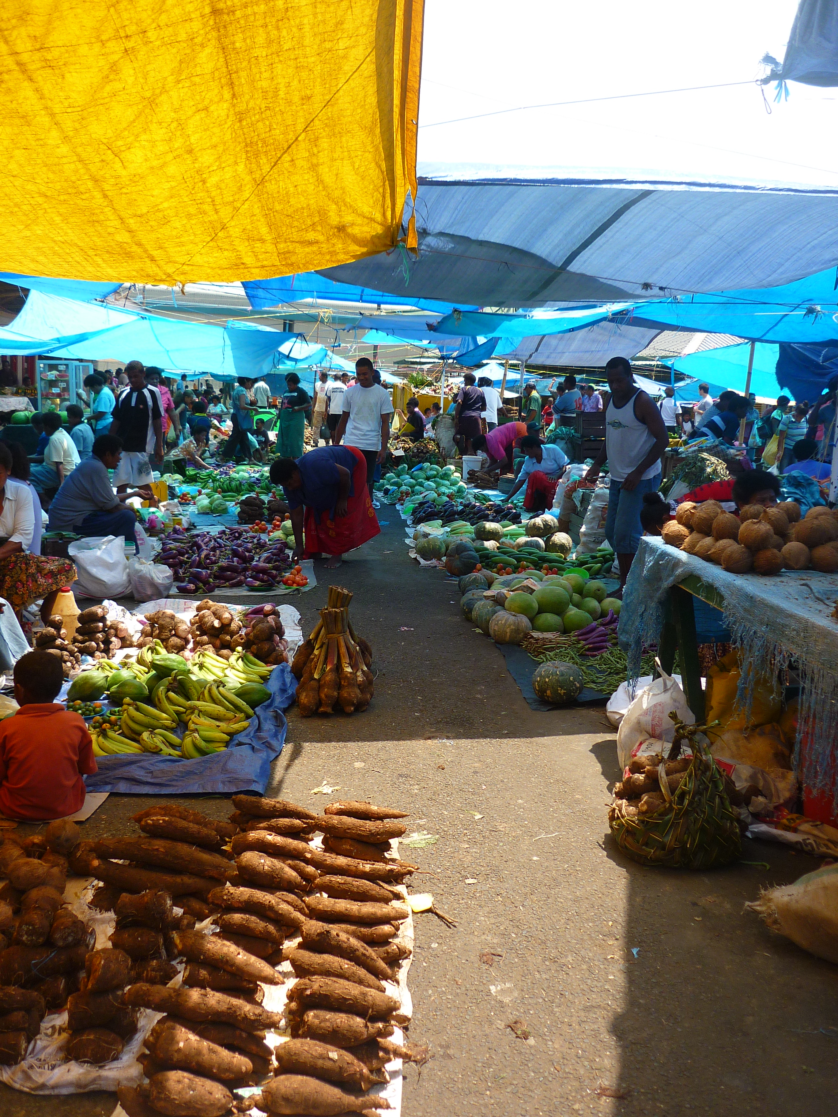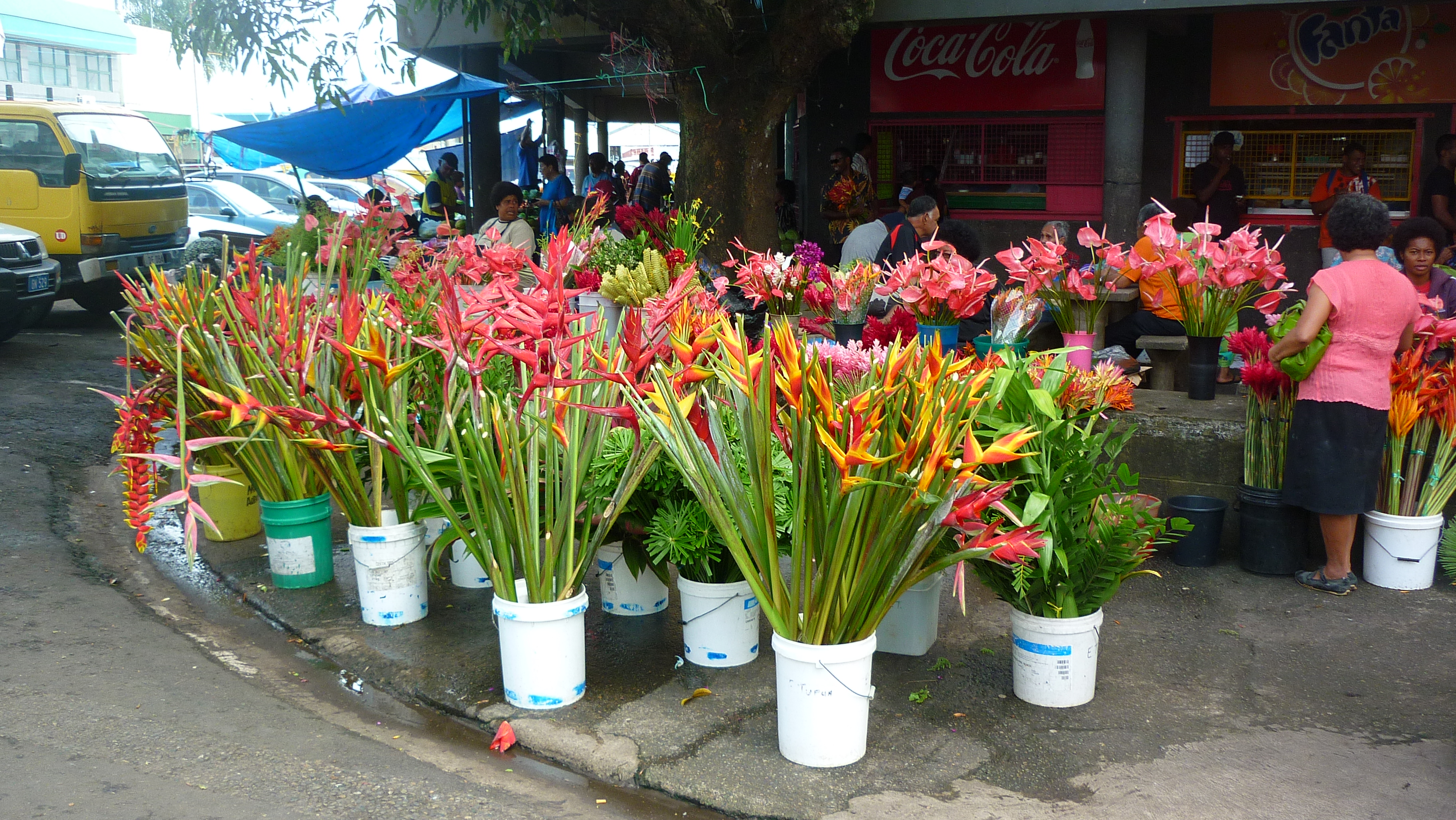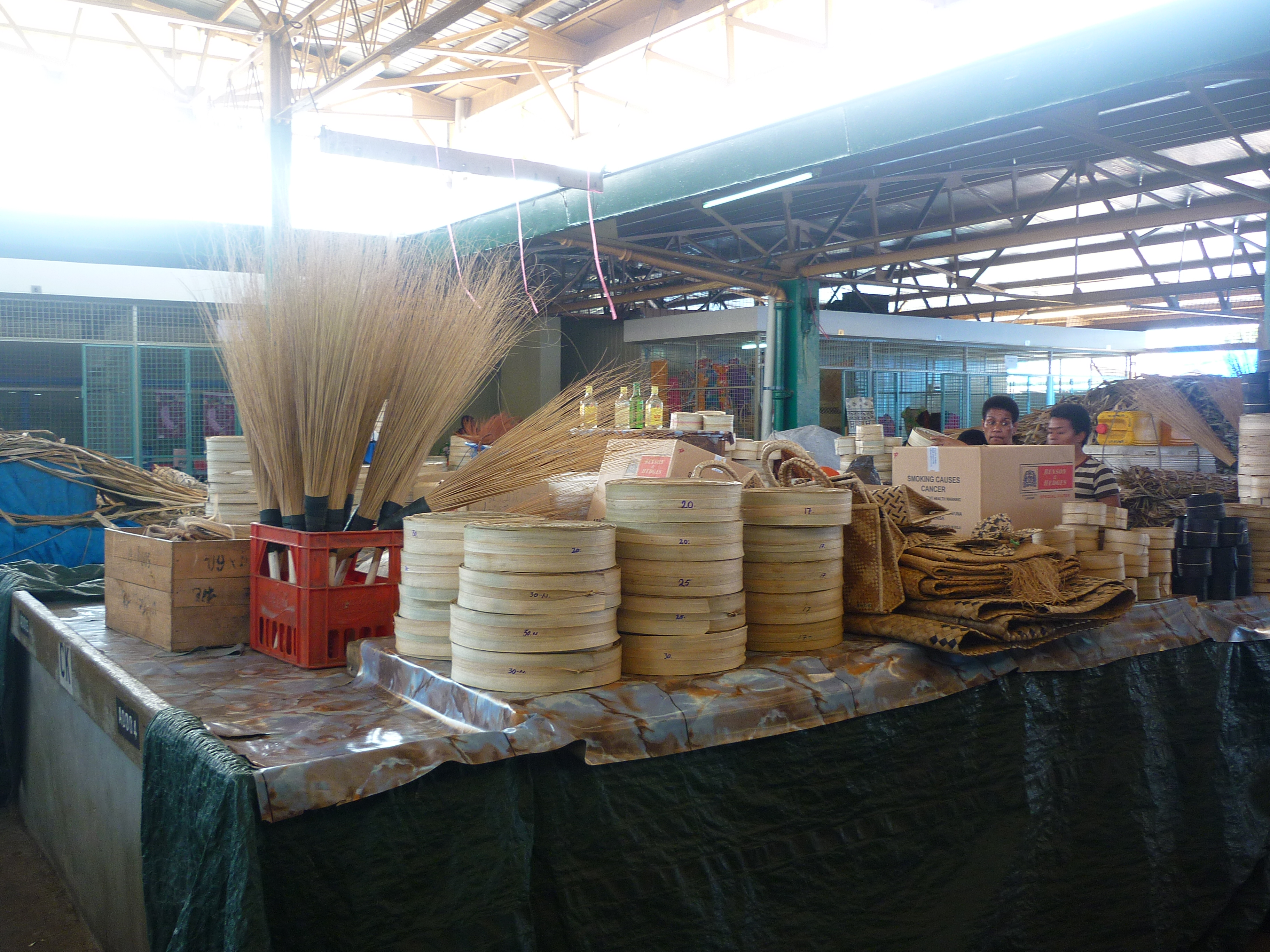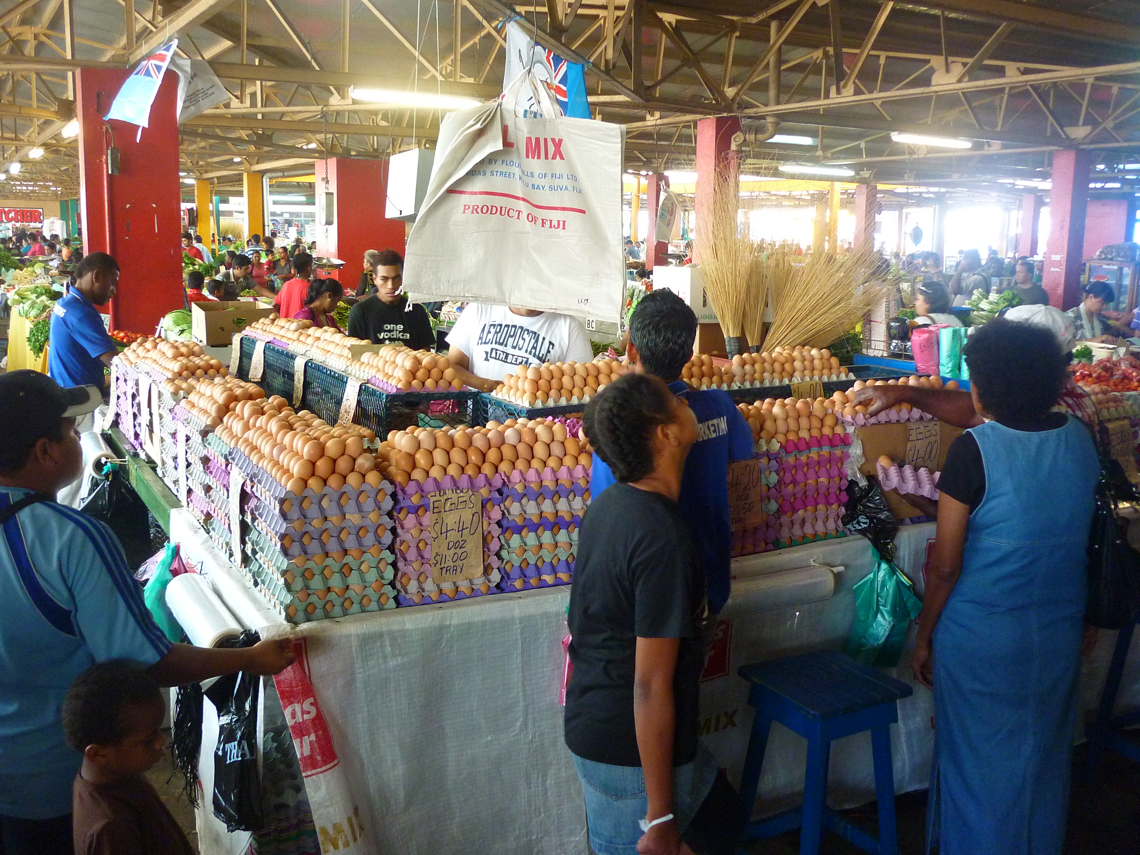 In Fiji, like most places we’ve been, Saturday is Market Day. Although the municipal market is open everyday of the week Saturday is when at it’s biggest and it’s best. People come from the surrounding towns, villages and islands to buy and sell fruits, vegetable and handmade goods. Often the people from far away will arrive in the city on Thursday and stay until end of Saturday. The permanent cement building in the center of Lautoka City is not big enough to house the influx of vendors, so the market overflows into the surrounding parking lot and courtyard and sprawls onto the sidewalks. Instead of the tables that are inside people outside spread plastic table cloths and old flour sacks on the ground and string up tarps with elaborate labyrinths of string for shade. It is shoulder to shoulder negotiating the cramped isles, often times getting pushed past your intended stop by the flow of people so that you have to double back when you find a break in the line of bodies.