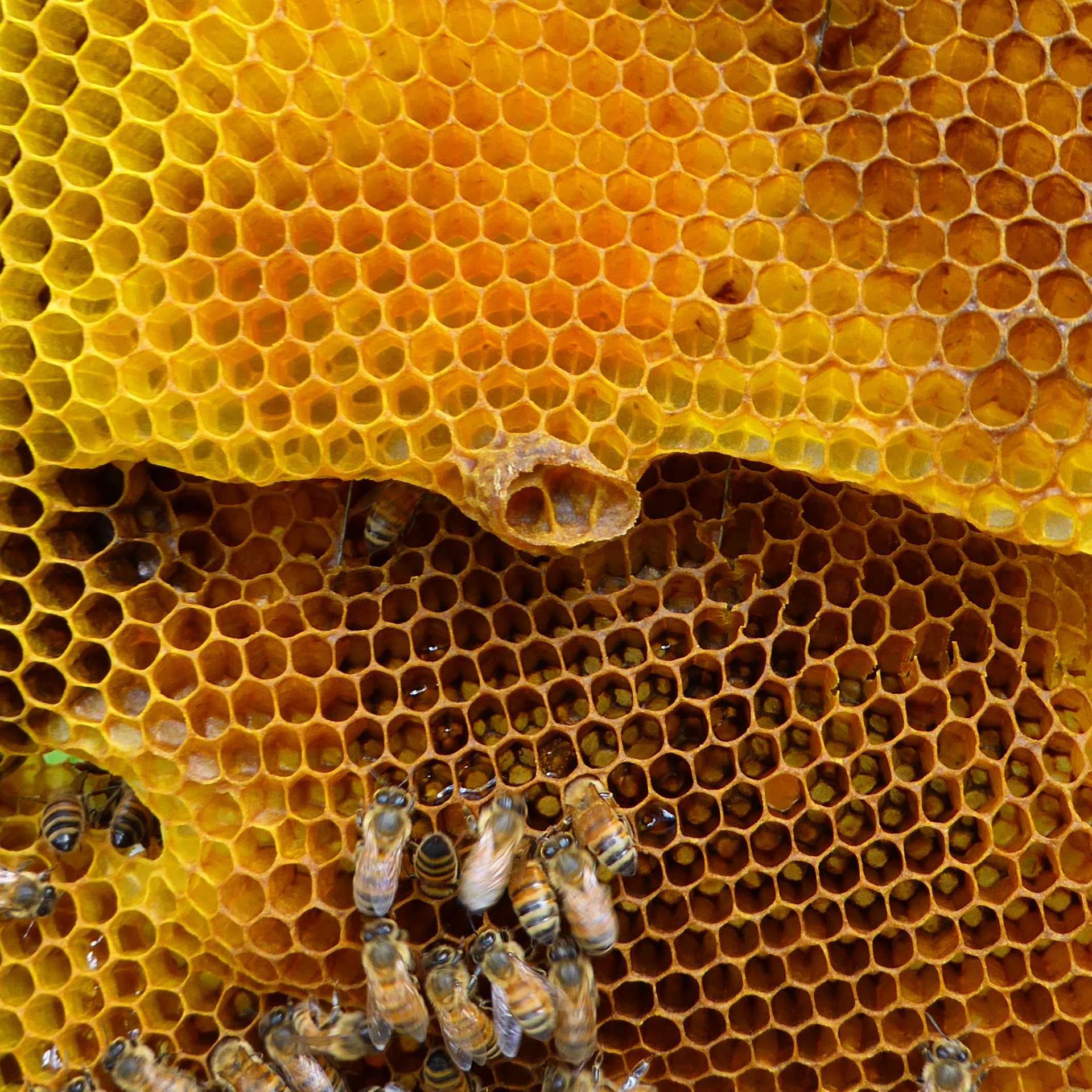 Opening the other hive and inspecting the bees I had been watching for the last several weeks was pretty exciting. We were both happy to see that the bees had started to expand the hive, building new wax cells on three blank frames. There was evidence of queen cells so Patrick suspected the hive had recently gotten a new queen, although we were unable to find her. We did find a nursery frame with several female nurse bees tending newly laid larvae. We even discovered a large, and beautiful, beetle that had been encased in propolis, a defensive tactic by the bees not only to thwart an intruder but to prevent the decaying body to contaminate the hive. Overall the hive was thriving.