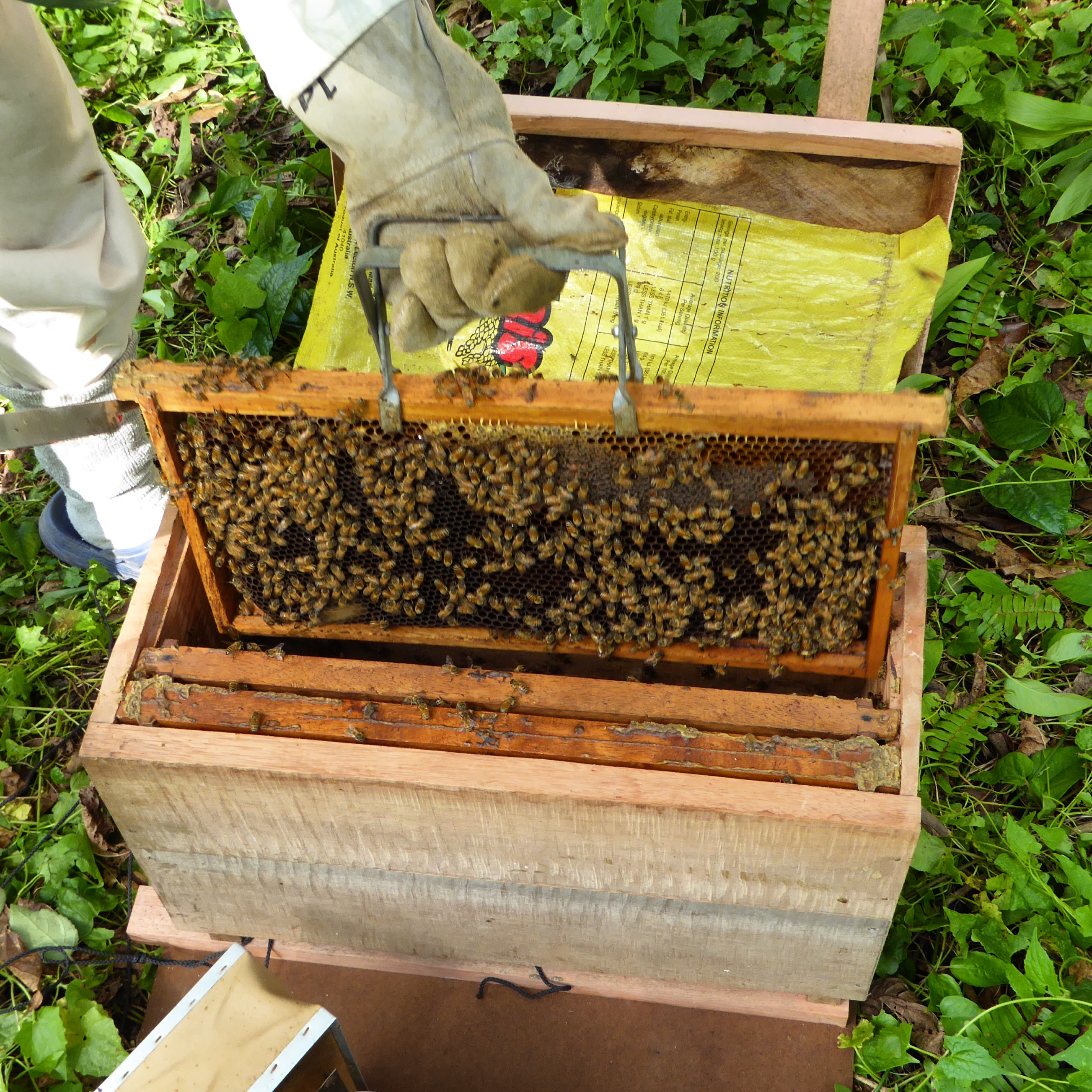 Anyway, couple of weeks ago Patrick relocated another hive onto the island and invited me to don a bee suit and help him move the bees into their new home, as well as check on health of the first hive. I was thrilled! I would finally get a look inside the hive.