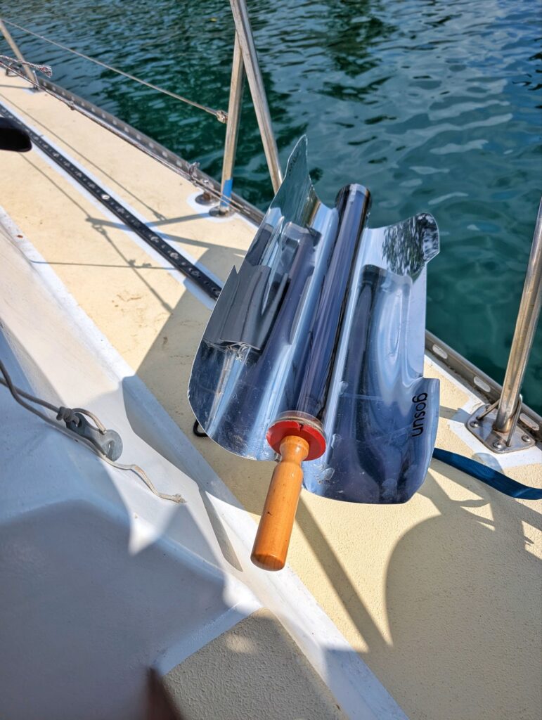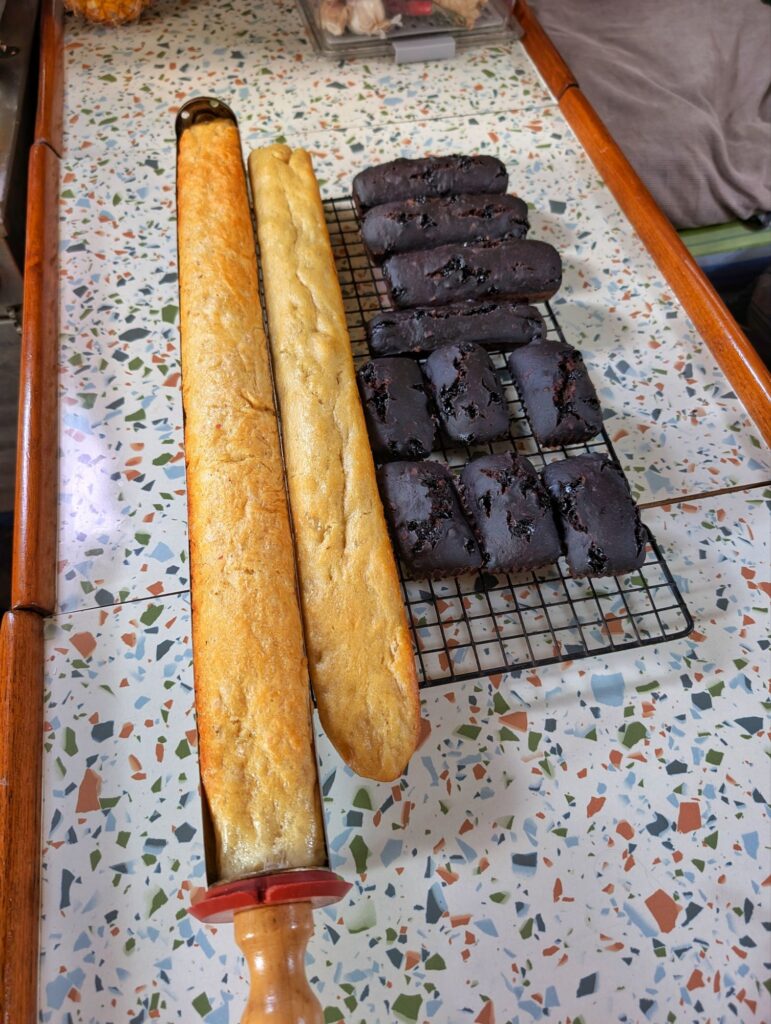 Dumplings and salad didn’t make a cohesive meal in my mind. Besides, I was staring at the two sticks of crusty bread cooling on the galley counter, the results of a productive day baking in my GoSun solar oven.