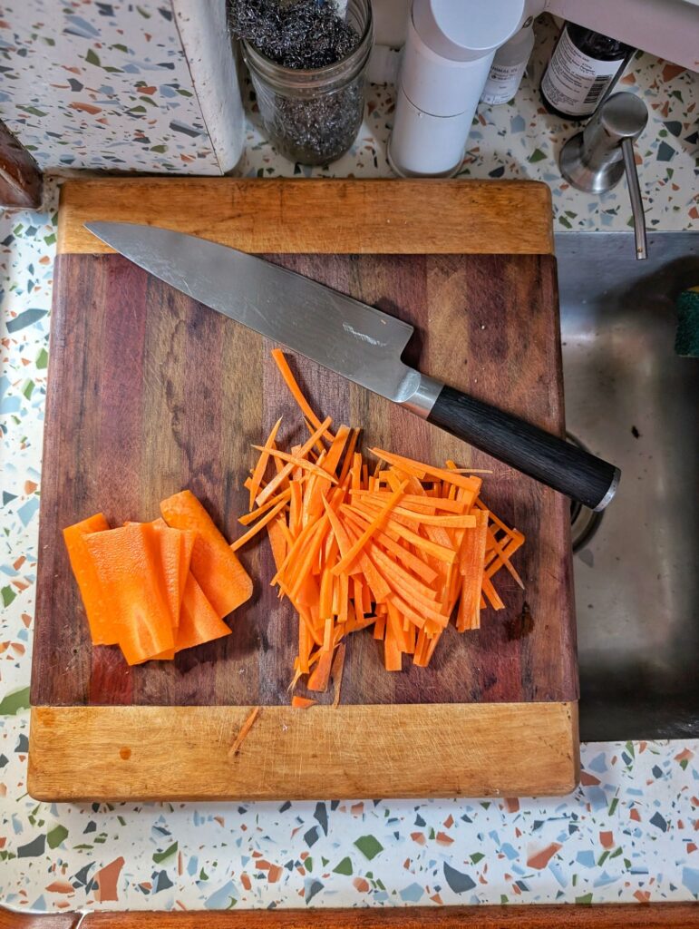 We had pork dumplings instead of pate and ham, and a focaccia style loaf instead of a crispy baguette, but I did have the cucumber, lettuce, chilies, and herbs. I always have plenty of fresh carrots in the fridge and debated about just grating some into the bowl but decided that it wouldn’t take much effort to take it to the next level.