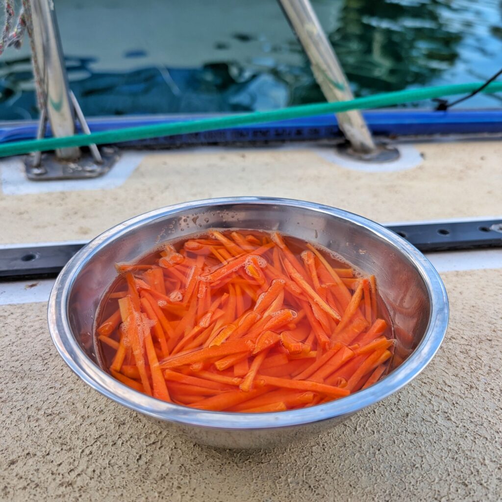 I transferred the carrots and brine into a metal bowl and placed it outside the galley window so it would cool a little quicker. If I had been planning ahead I would have done this in the morning or the day before and bottle them so the pickles had time to chill in the fridge.