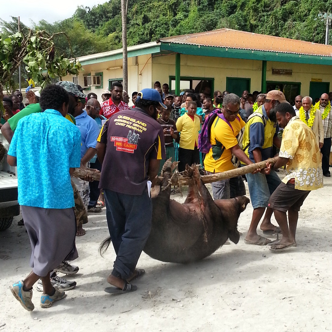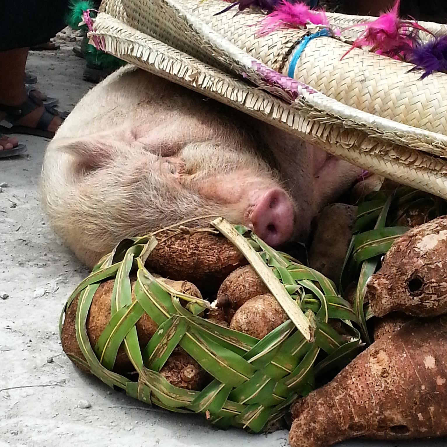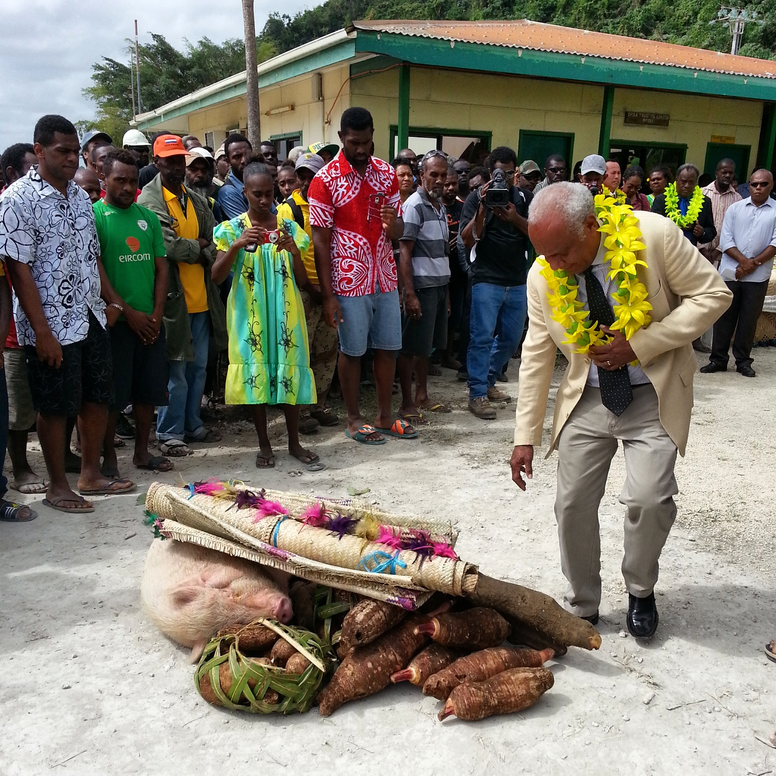 I also somehow ended up with a front row seat at the ceremonial exchange of gifts between Prime Minister Sato Kilman and Chief Mantoi Kalsakau III. A live pig, root crops, kava plants and woven mats (the pillars of life in Vanuatu) were presented. Each man circled his pile of gifts, bending to touch each item in acceptance. The PM wore a flower wreath and the Chief wore a pig tusk around his neck.