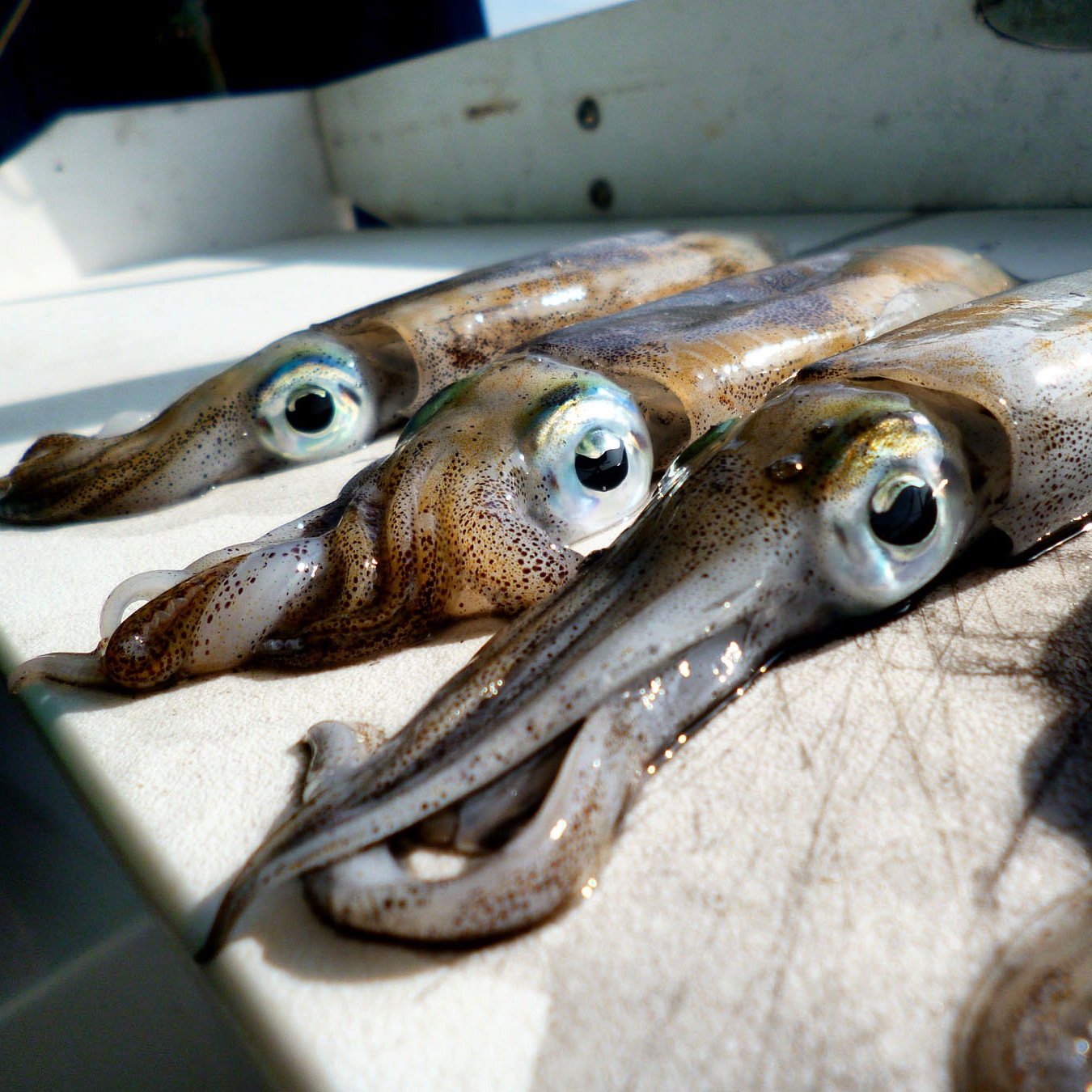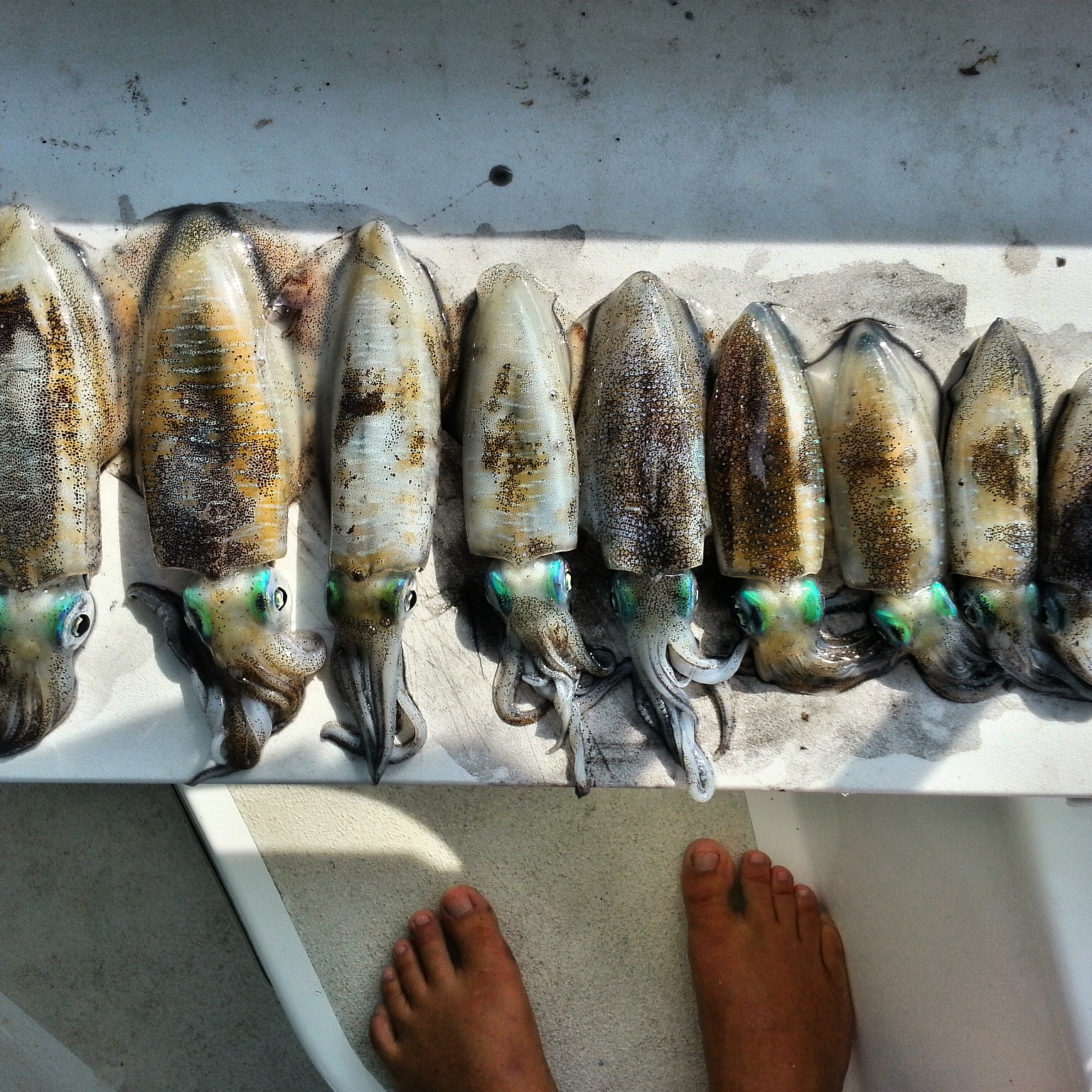 Drop a squid jig tied to a piece of fishing line over the side and wiggle it up and down a couple times. If the squid like it they grab a hold, get caught on the barbs and then up you go and into the bucket. The trick is trying to get the darn things into the bucket before, or after, they ink.