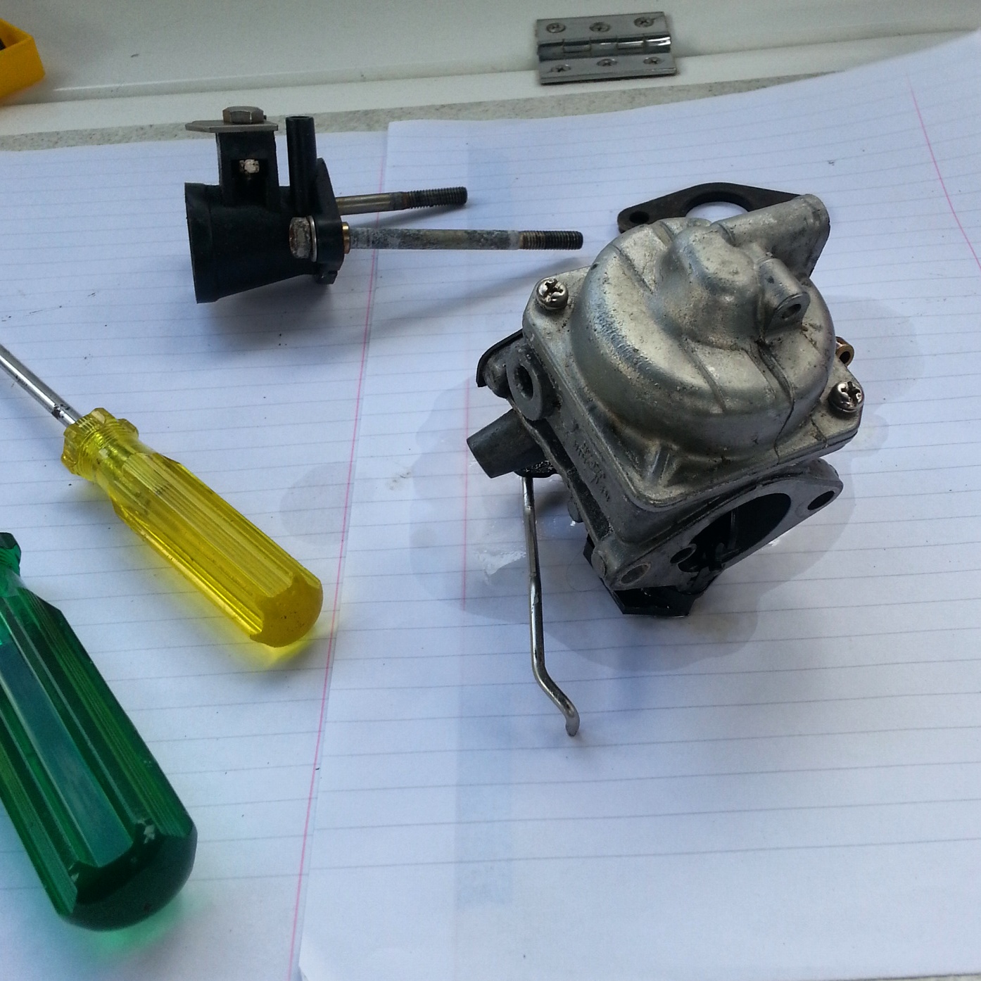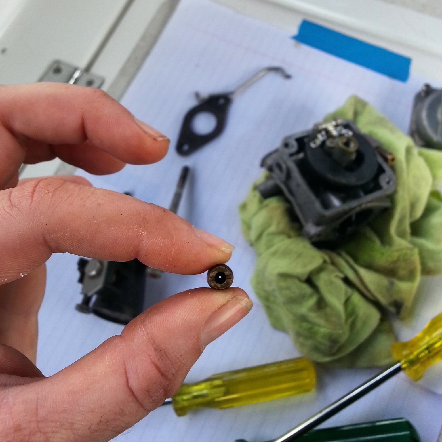 Since it was getting fuel from the tank the next logical conclusion was that the carburetor was gummed up. It had now been a couple months since it had been sitting on the rail and gasoline deteriorates. Over time the microscopic particles will separate and wreak havoc in the teeny tiny jets of the fuel injection system. We’ve had this happen before and I knew that to clean the jets required removing and dismantling the carburetor. I wasn’t sure I was up for the job, but I wasn’t ready to admit defeat. I consulted with Steve and he was so confident in me that he me made me a diagram and sent encouragement.